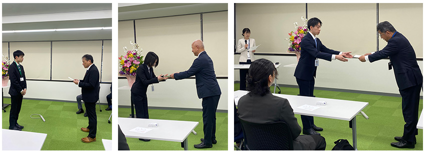 入社式ではグループ代表 木下道臣が祝辞を述べた後、各社代表が新入社員一人ずつ入社辞令を交付しました。